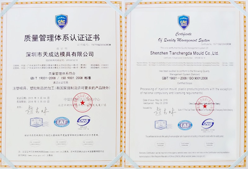 國(guó)際化、現(xiàn)代化經(jīng)營(yíng)過(guò)程中天成達(dá)模具十分注重生產(chǎn)流程、質(zhì)量管理標(biāo)準(zhǔn)化和規(guī)范化的建設(shè)。為此,天成達(dá)長(zhǎng)期秉持著“精密制造,為客戶提供有競(jìng)爭(zhēng)力的產(chǎn)品;持續(xù)改進(jìn),為客戶提供優(yōu)質(zhì)滿意的服務(wù)”的質(zhì)量方針和宗旨。全員參與、全面品管,有效執(zhí)行ISO9001國(guó)際質(zhì)量體系標(biāo)準(zhǔn)。并對(duì)所有來(lái)料供應(yīng)商進(jìn)行嚴(yán)格的評(píng)估和考核,確保所有來(lái)料均符合工藝加工標(biāo)準(zhǔn)。